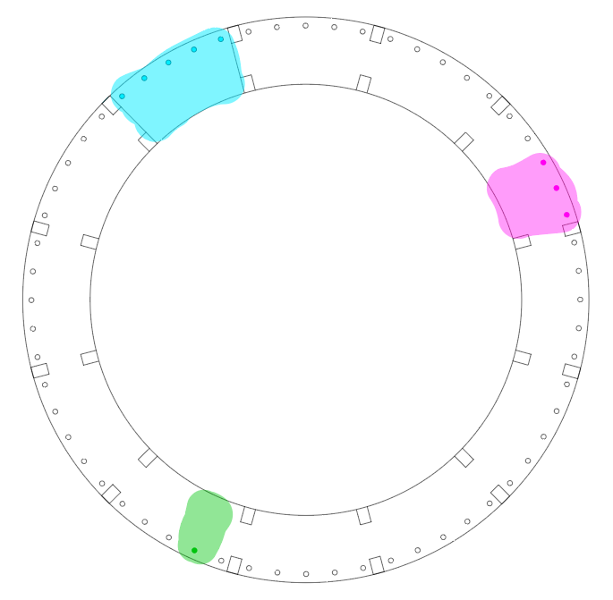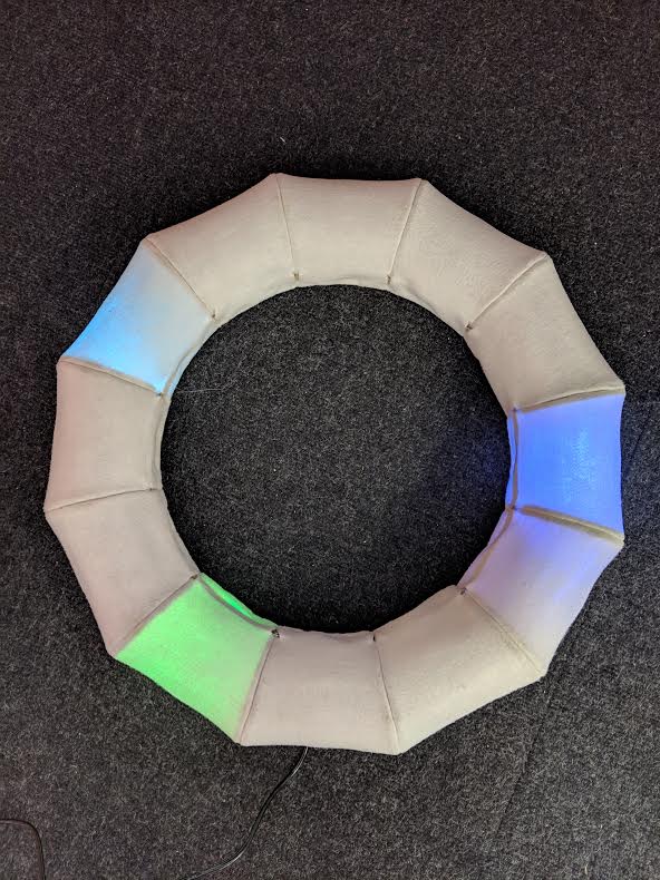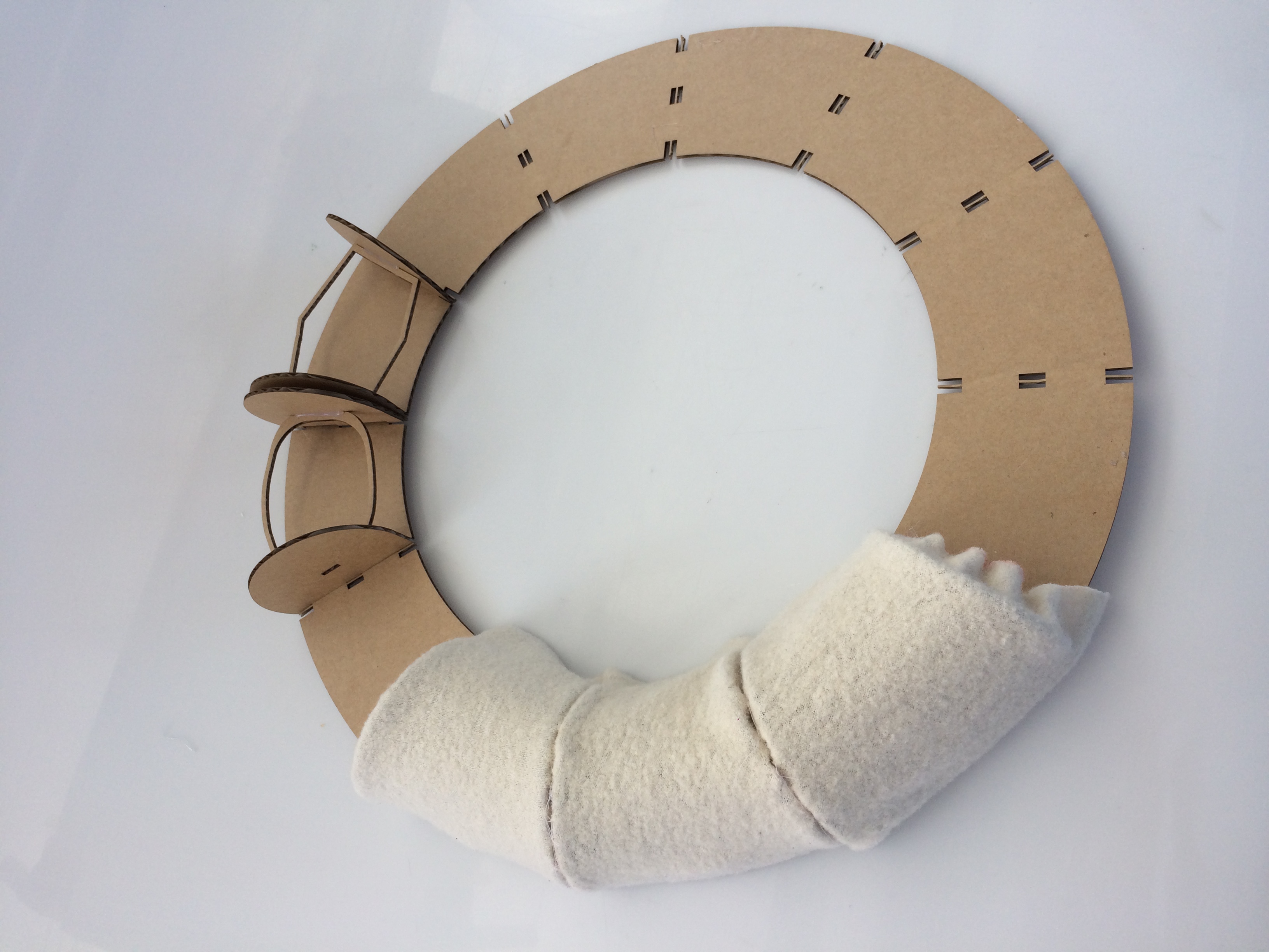 I then changed the measurements of the illustrator file to have the Neopixel strip running along the inside circumference and the light shining outwards. This size worked a lot better visually. Another iteration I made was to shorten the segmenting pieces so that the profile of the clock won’t be as tall but light will show up brighter / not as diffused. To test out how fabric would sit on the form I made a basic paper stencil as Emma suggested and adhered fabric off an old dressing-gown over each section..