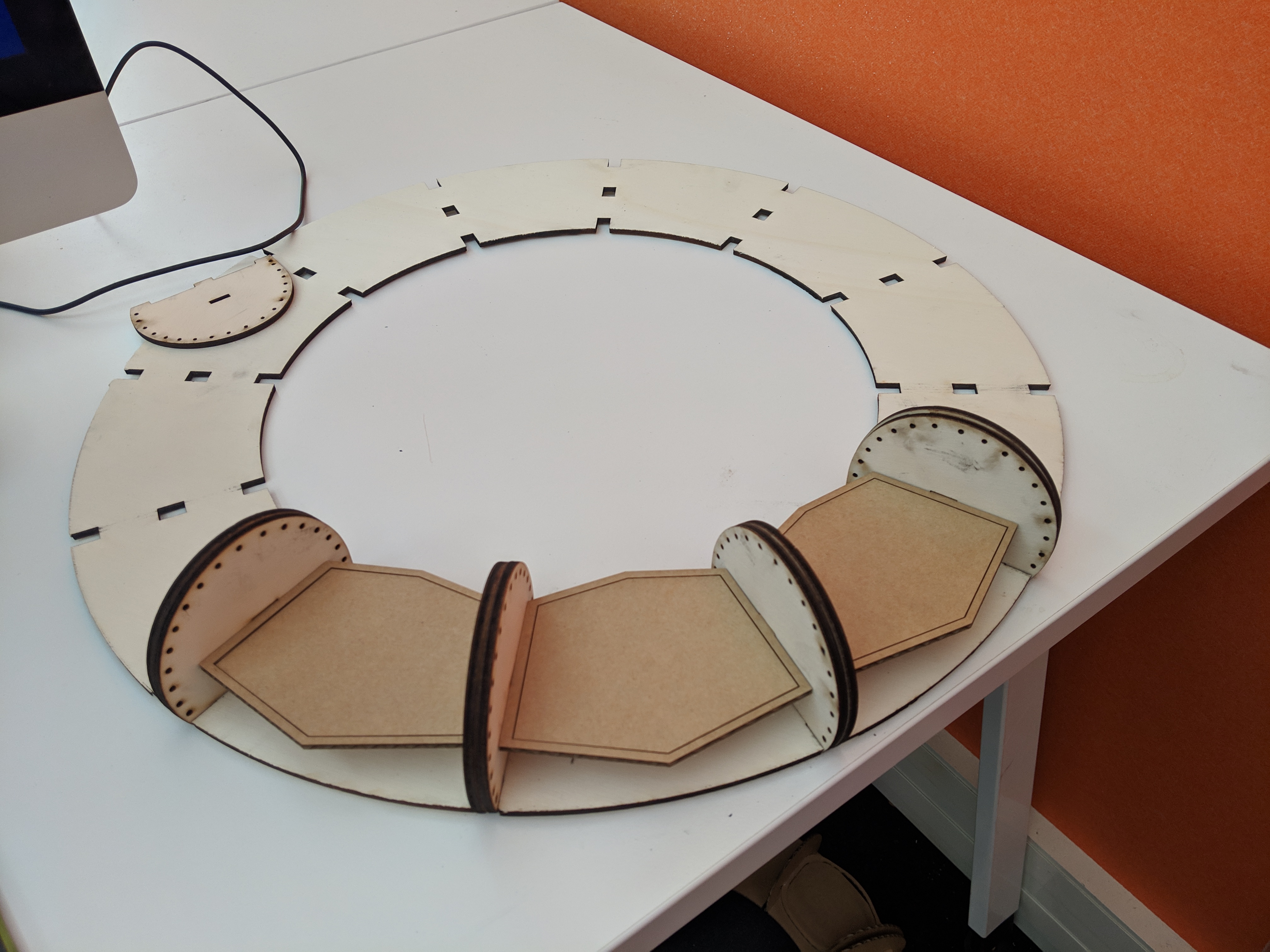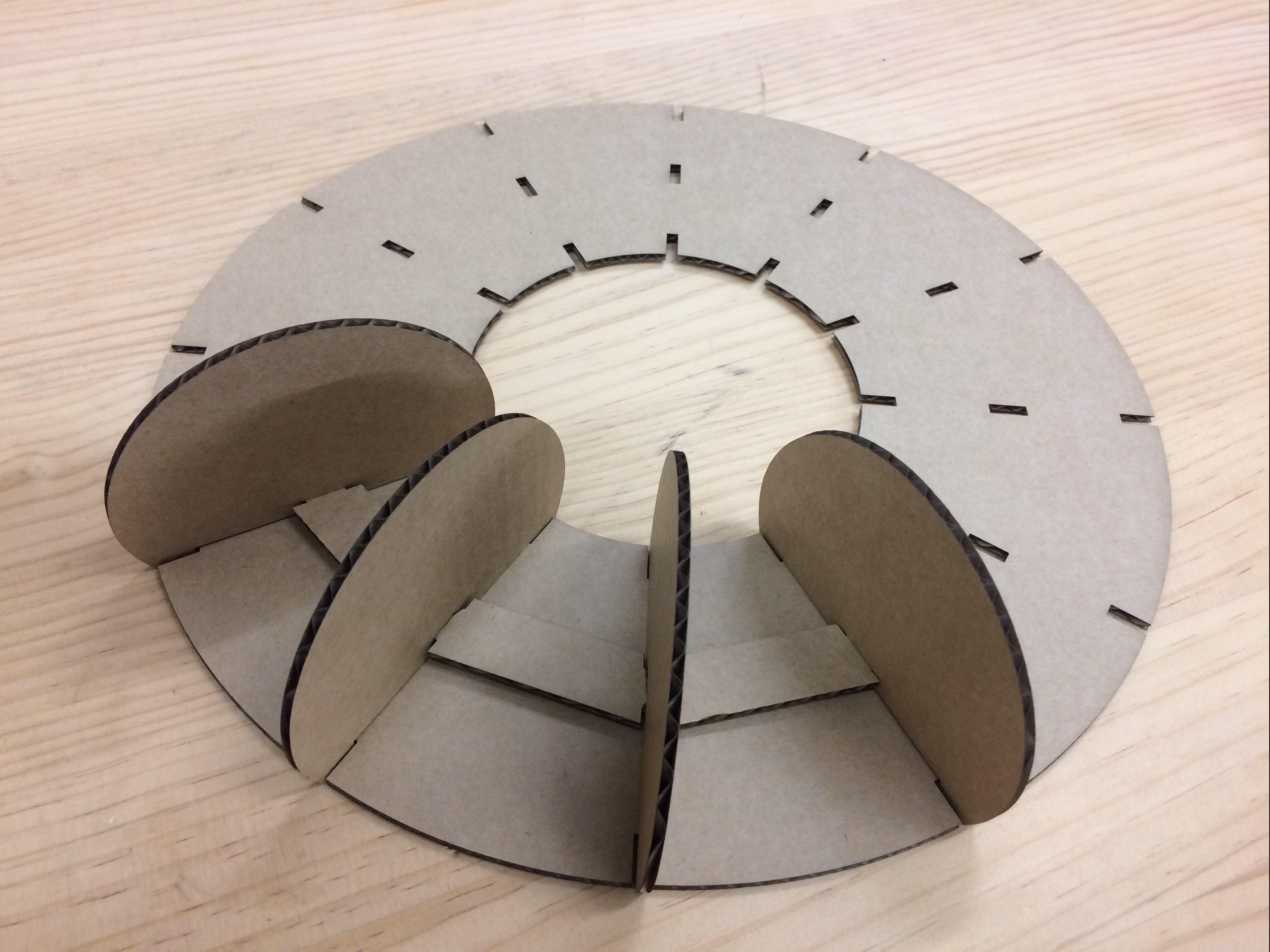 This was my first prototype. I created a simple illustrator file with measurements for the neopixel strip to fit around the outer circumference, with the light shining inwards. My laser cut on cardboard went well and the pieces fit together but the size in person seemed too small and I would rather the light shone outwards.