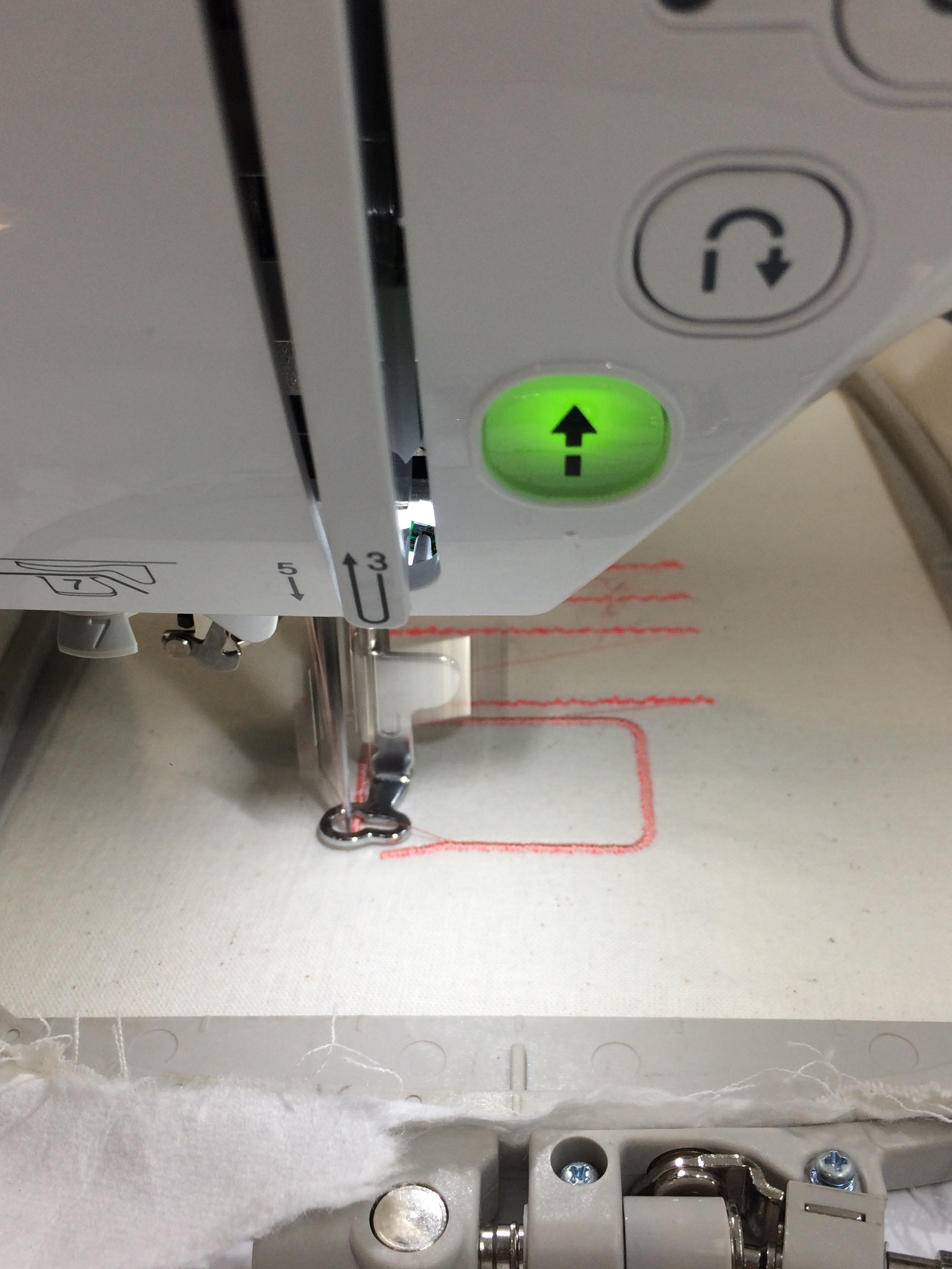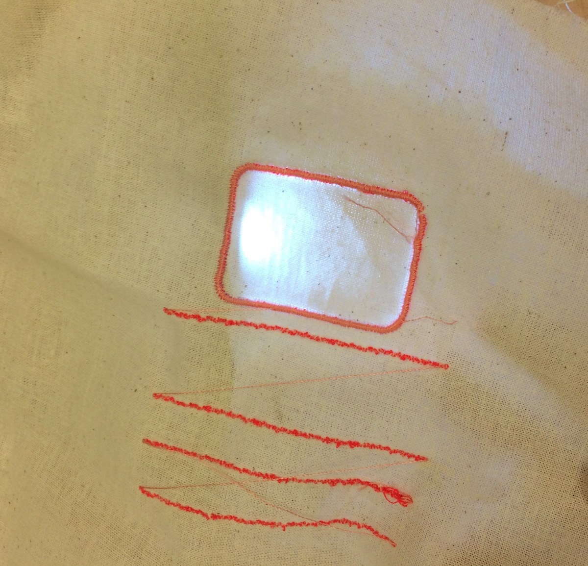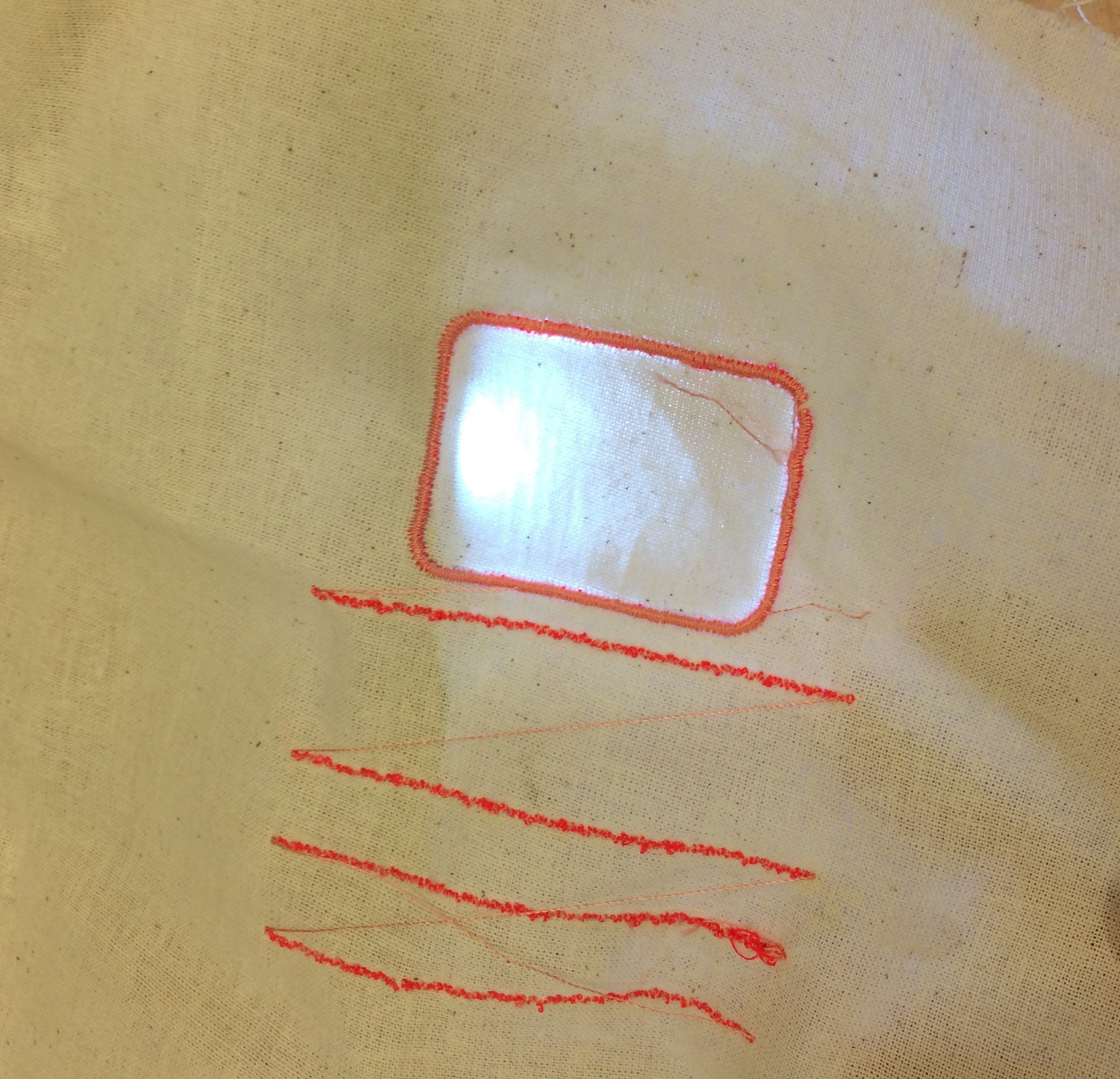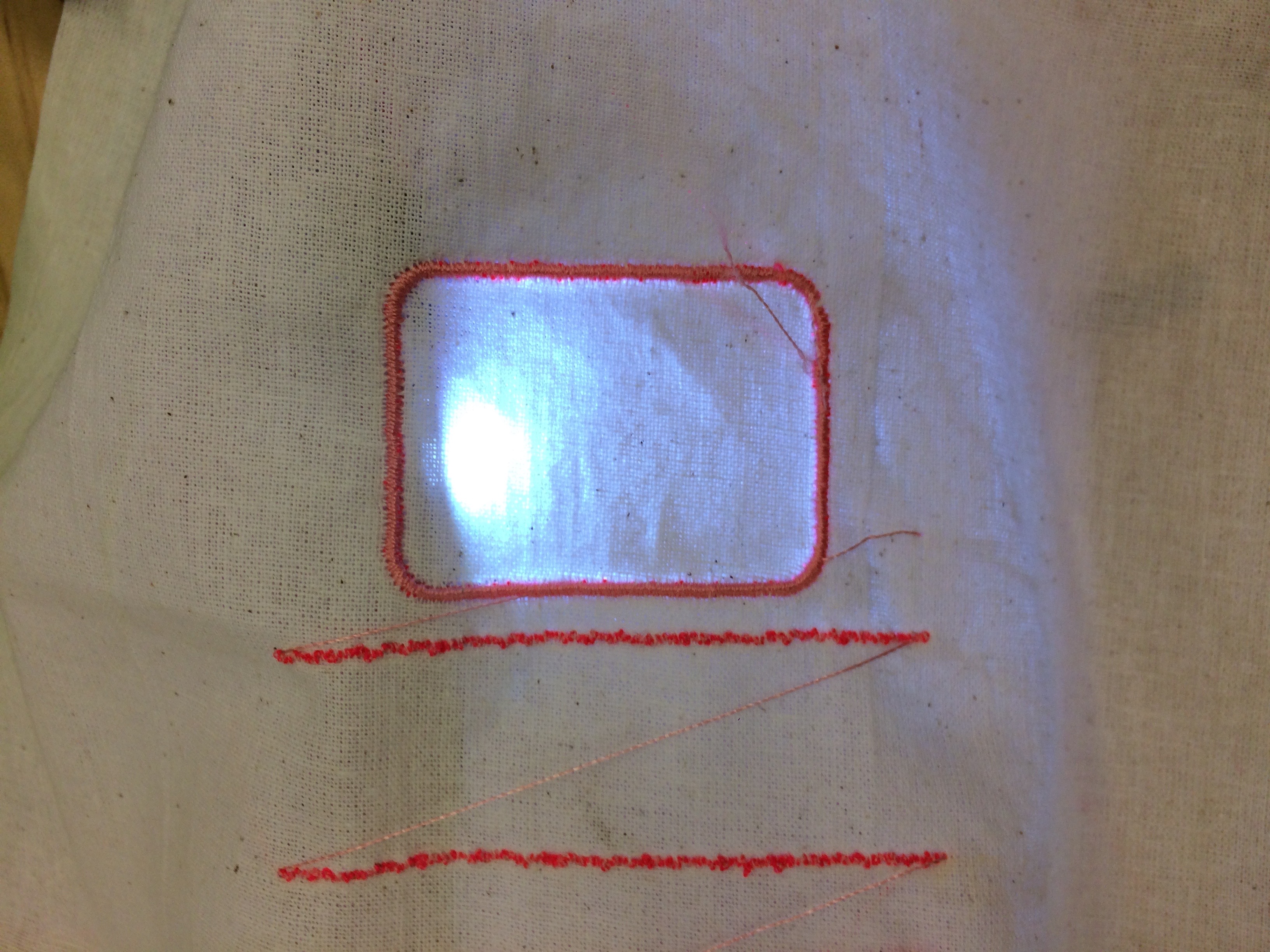 The embroidery seems to focus the light between the lines. It shines brightly next to the stitches where the needle had poked holes.