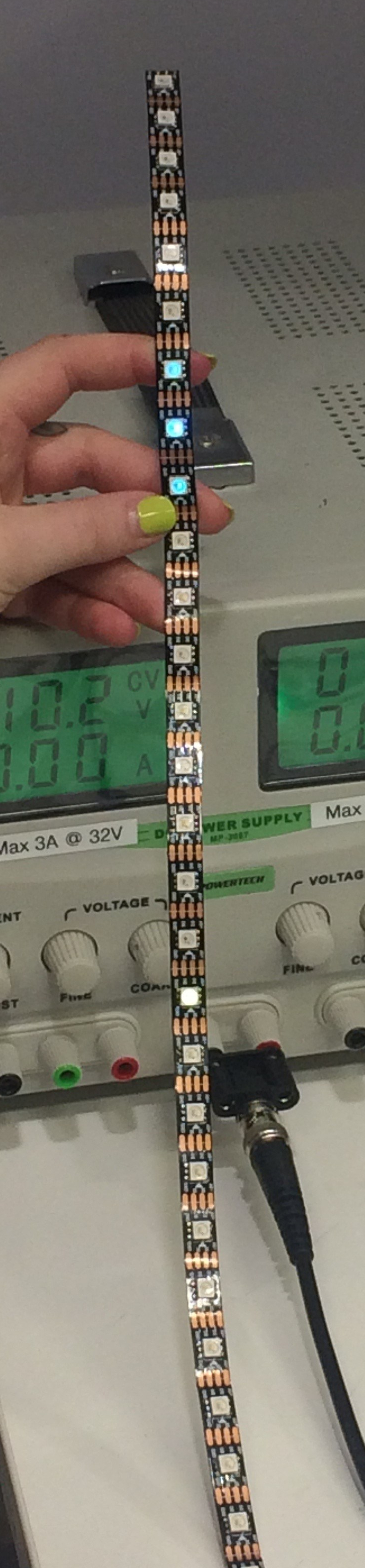 We are testing out more open sources codes using the long neopixel strip. This means we need an external power source because running too many LEDs through a USB port can cause it to blow up. The green display below must show below 5 volts (shows 4.9).